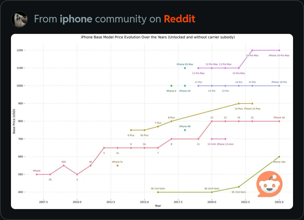 Un grafic frumos de pe r/iphone exemplifică evoluția prețurilor la modelele de iPhone în decursul anilor.